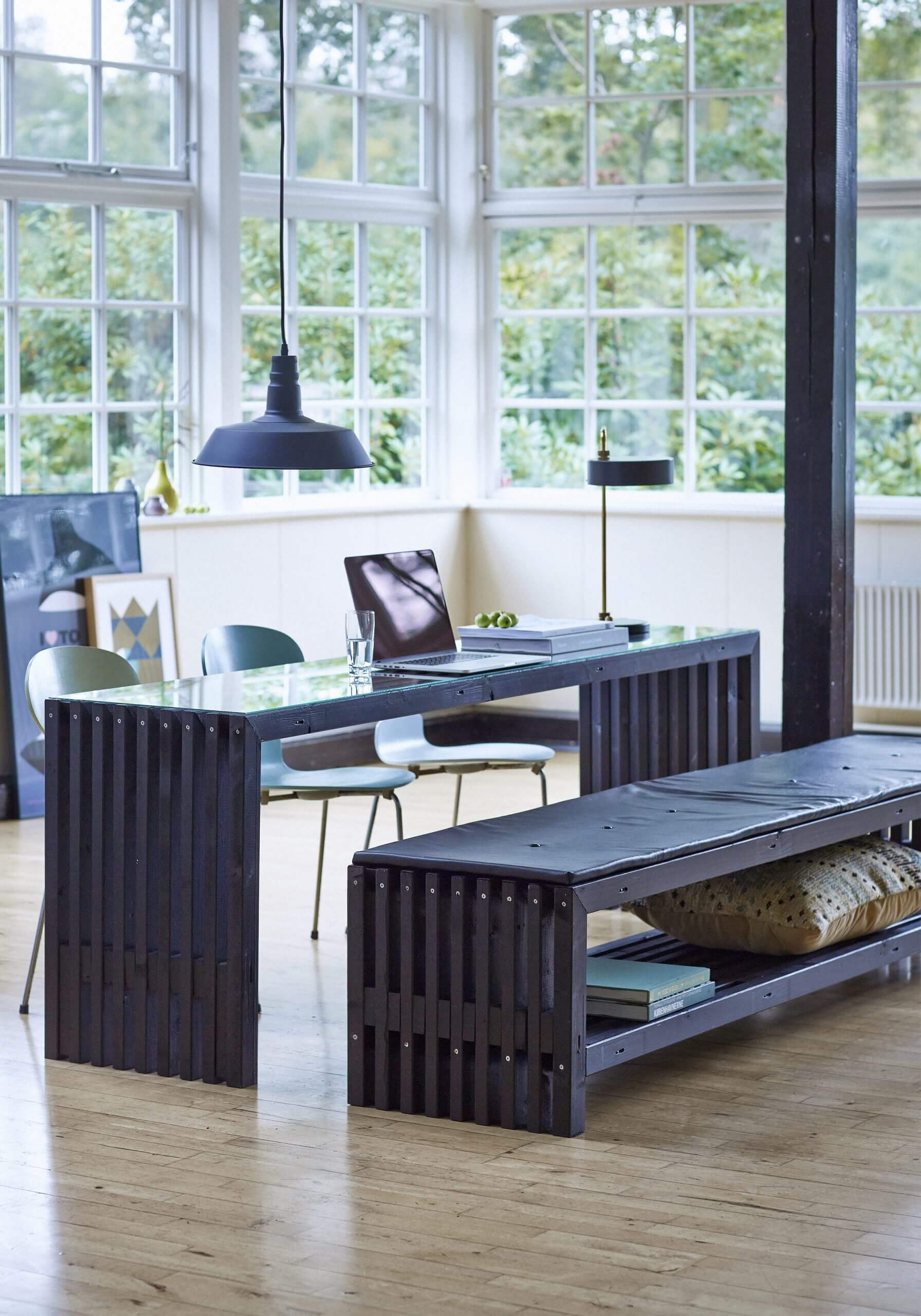 Trallebænk med hylde – 218×49 cm – fås i 2 farver