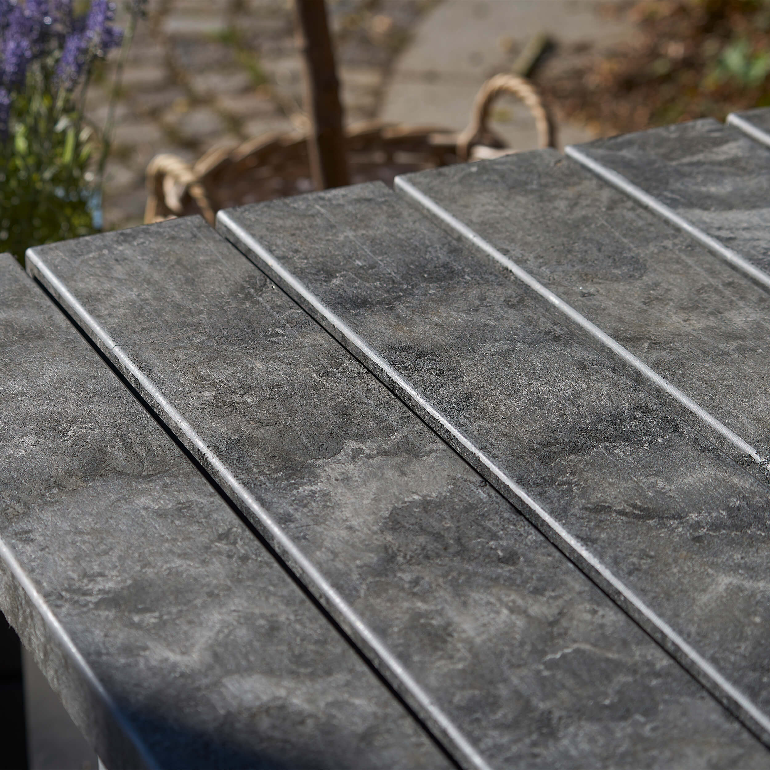 Rustik overflade og struktur. Hver planke er unik og farver kan derfor variere. Massive planker forstærket med stålprofil. Afrundede kanter. Vedligeholdelsesfrit og gennemfarvet.